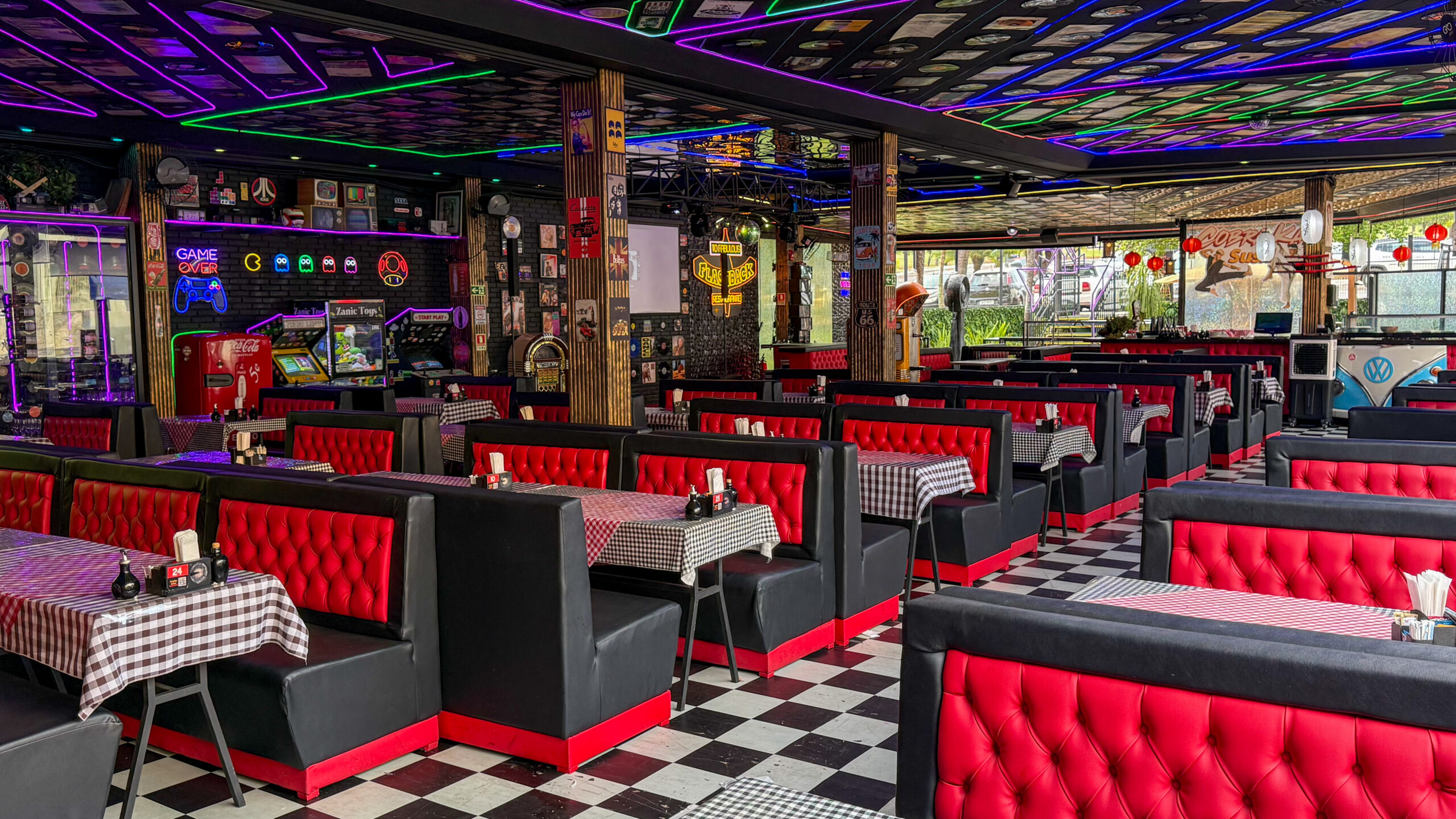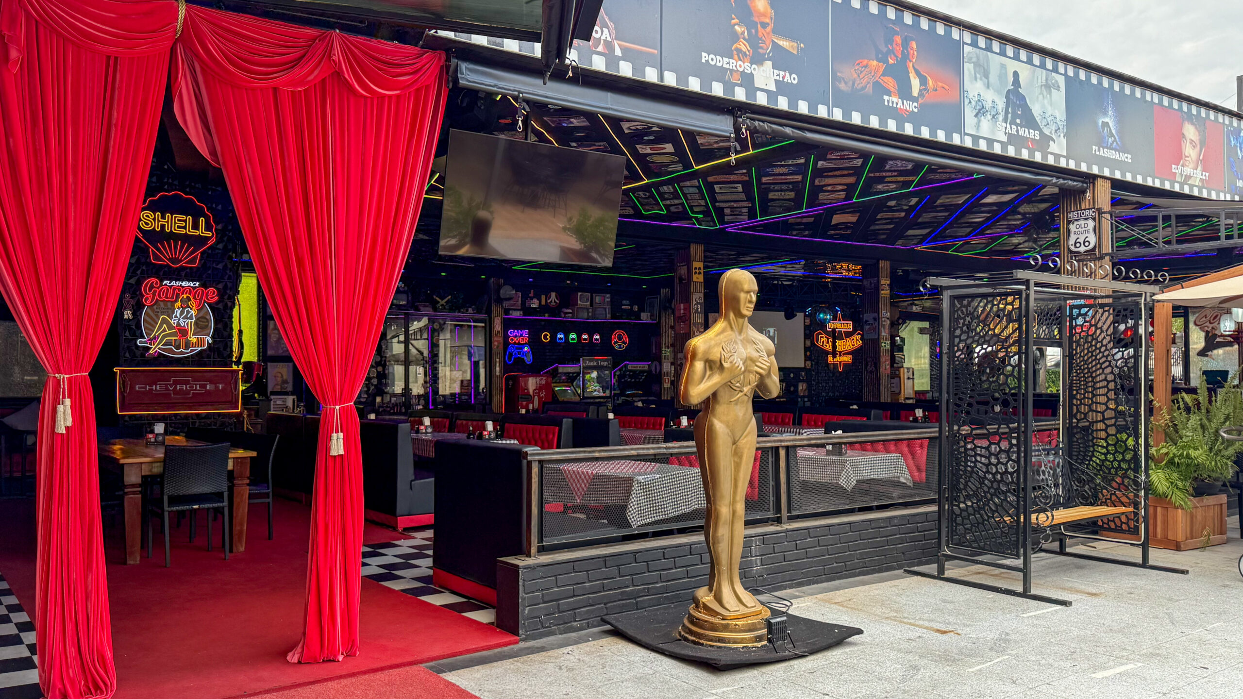 O ambiente é totalmente temático: há pista de dança iluminada, jogo de luzes que transforma o espaço à noite, quadros retrôs de personalidades que marcaram época e até uma bomba de gasolina retrô que serve chope — um símbolo da irreverência e do espírito divertido da casa.