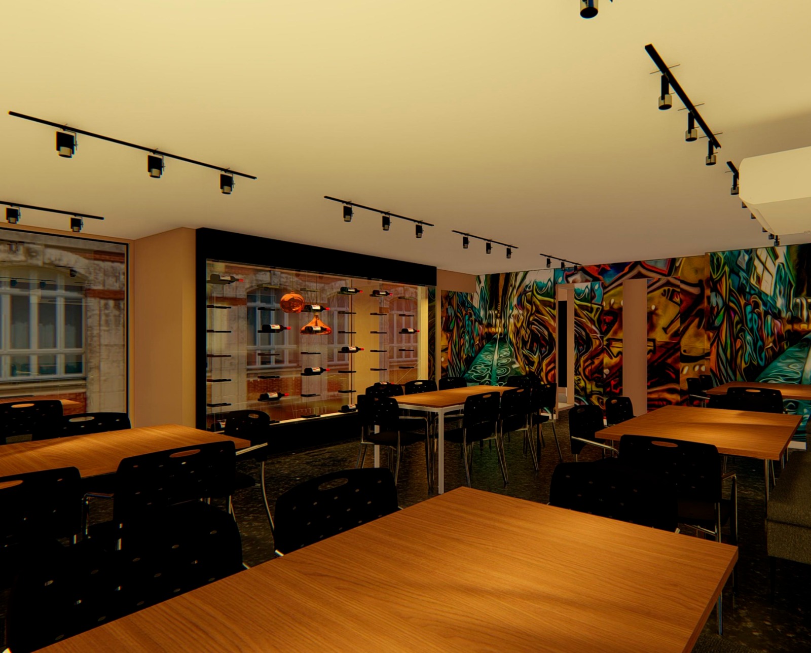 Já o mezanino será um ambiente mais reservado, ideal para reuniões e para clientes que gostam de um espaço mais calmo. Nele, foi instalada uma linda adega com mais de 200 garrafas com rótulos das importadoras Videira e Vinhos SA, de sete países diferentes – Brasil, Argentina, Chile, Itália, Espanha, Portugal e França. Outro ponto alto é a decoração com iluminação retrátil e um lindo grafite na parede desenhado pelo artista plástico Rogério Mendonça.